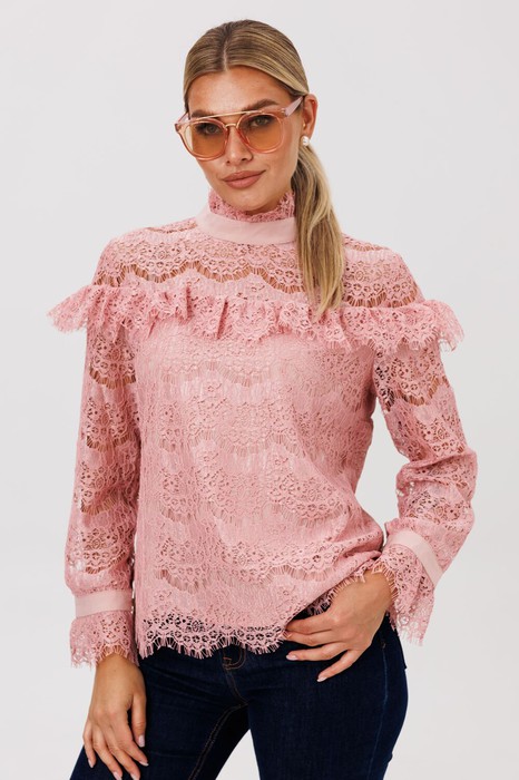 Кокетливая блуза с нотками романтизма выполнена из плотного кружевного полотна. Её прямой силуэт украшен изысканными конструкторскими деталями: отрезные кокетки по переду и спинке мягко подчеркнуты воланом, а воротник-стойка и королевские манжеты на рукавах декорированы ажурной кружевной отделкой. Застёжка на пуговицы, расположенная по задней стойке, добавляет модели особый шарм.