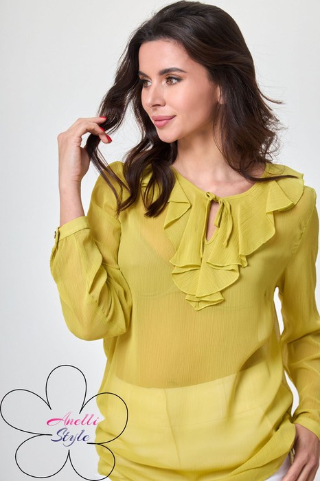 Блуза прямого силуэта, длиной до середины бедра. Рукав втачной, длинный, низ со сборкой, на узкой манжете. По переду капля и фиксируется бантом, горловина декорирована рюшей. Отличный офисный вариант и актуальная цветовая гамма на выбор.