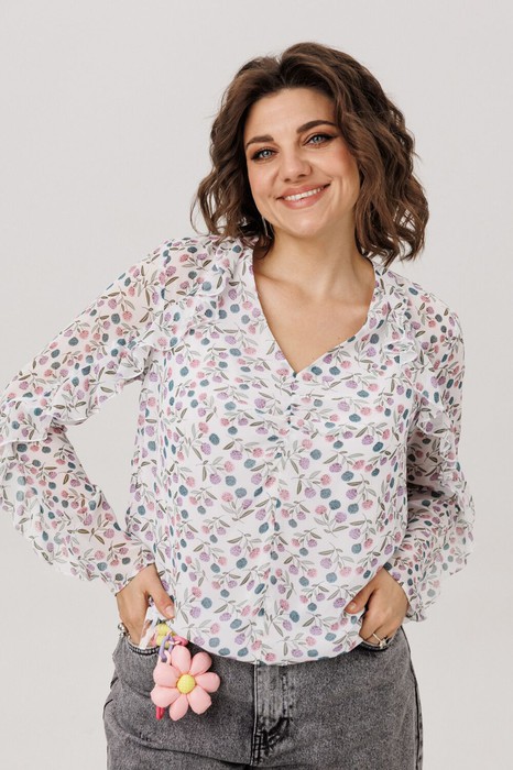 Главная мелодия образа - волнующий волан, что, будто случайный шёпот, рождается у самой горловины и, следуя изгибу кокетки, закручивается вокруг рукава нежной спиралью, полной романтики. Глубокий V-образный вырез подчёркивает изящество линий, а скрытая подкладка по переду и резинка по низу дарят комфорт, делая эту блузу от Анелли идеальным спутником для создания лёгкого и вдохновенного образа на каждый день.
