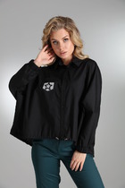 Прямой силуэт, втачной рукав, рубашечный воротник на стойке, функциональная застёжка на пуговицы по всей длине.