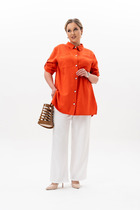 Блузка свободного силуэта. Воротник рубашечного типа на притачной стойке. Перед с центральной застежкой на петли/пуговицы на притачных планках, кокеткой и нагрудными карманами с клапаном. По спинке - кокетка. Рукав втачной длинный, со спущенным плечевым швом, на манжете с застежкой на пуговицу.