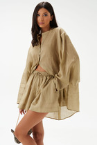 Блуза свободного кроя. Выполнена из лёгкого натурального полотна рами. Вырез горловины V-образный. По переду регулируемая кулиска. Рукав цельнокроеный. Длина рукава от горловины 46 см. Длина спинки 72 см