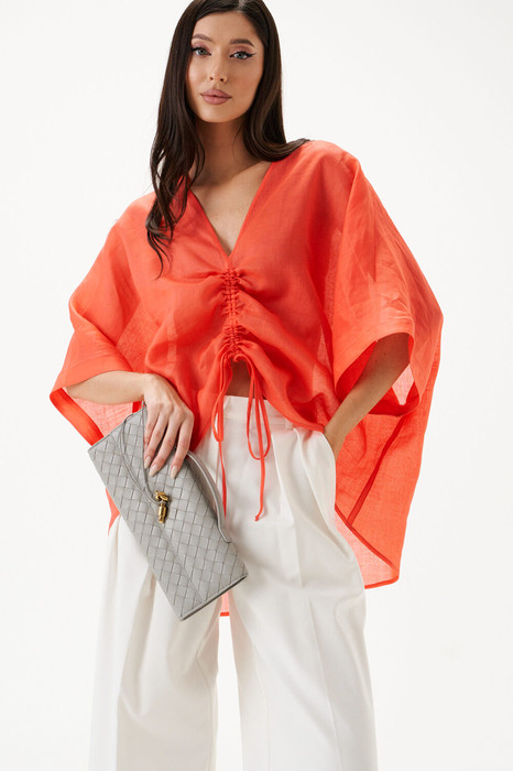 Блуза свободного кроя. Выполнена из лёгкого натурального полотна рами. Вырез горловины V-образный. По переду регулируемая кулиска. Рукав цельнокроеный. Длина рукава от горловины 46 см. Длина спинки 72 см