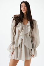 Блуза свободного кроя. Выполнена из полупрозрачного полотна рами кораллового цвета. Вырез горловины V-образный. Рукав втачной, спущенный, низ присборен на резинку. По переду выше линии груди и по спинке отрезная деталь со сборкой, по переду с завязками. Спинка с кокеткой. Длина рукава от линии втачивания 64 см. Длина спинки 70 см
