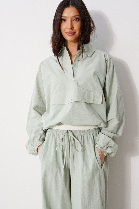 Блузон прямого свободного кроя выполнен из хлопковой ткани, в оттенке светлой оливы. Характеристики: отложной воротник, застежка центральная на петли пуговицы, по переду имитация кармана. Низ изделия на резинке с фиксатором, на спинке расположена надпись "Made in Belarus. Annete". Плечо спущено, рукав свободный, низ рукава на резинке. Длина по спинке 58 см, длина рукава от края горловины 83 см.