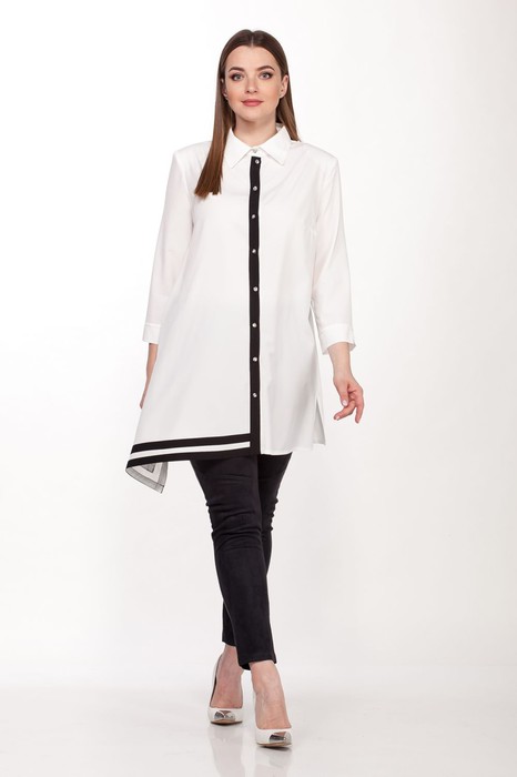 Блузка женская асимметричная выполнена из тонкой блузочной ткани, свободного силуэта с одной стороны по полочке расширенная к низу, в боковых швах разрезы, воротник на стойке,планка втачная, застежка на петли и пуговицы. Рукав втачной 3/4 с притачным манжетом с разрезом. Длина изделия 80 см, рукава- 50 см.