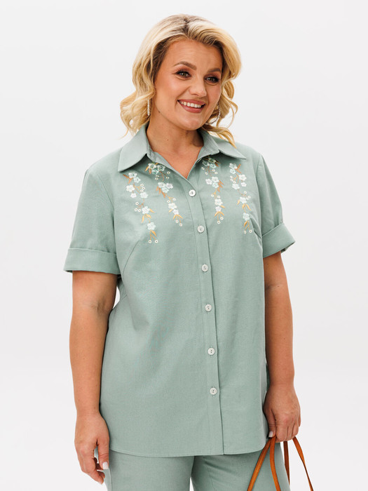 Льняная с вискозой блузка полуприлегающего силуэта. Застежка на петли - пуговицы. Рукав короткий. По боковым швам - разрезы. По переду расположена вышивка . Идеальная блузка для летней жары, в ней ваша кожа будет дышать. Отличный вариант, как для городского лета, работы, встреч и отдыха на море.