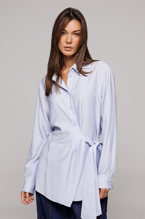Блузка прямого силуэта, с втачным одношовным рукавом, внизу со складкой и манжетой, с застежкой на петлю-пуговицу. Полочка с застежкой на петли-пуговицы до талии по притачной планке, которая переходит в завязку и с права в боковой шов вставлена 2 часть завязки. Спинка с кокеткой и бантовой складкой от кокетки. Воротник рубашечный отложной на стойке. Спинка и полочка с фигурным низом. Внизу по боковым швам обработаны разрезы.