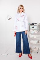 Блузка из креп-шифона с напылением. Прямого силуэта, с втачным рукавом внизу на манжете с застежкой на петли пуговицы. Полочка с центральной застежкой на петли-пуговицы на цельнокроеной планке. Воротник рубашечный отложной на стойке. Спинка и полочка с фигурным низом. Внизу по боковым швам обработаны разрезы.