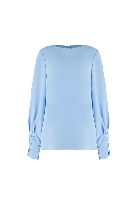 Блузка женская, прямого силуэта. Застежка по спинке на петлю и пуговицу. Рукав втачной, по низу с застроченными складками и манжетой, застегивающейся на петли и пуговицы.
