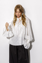 Блузка + топ. Блузка выполнена из органзыс цветочным принтом. Блузка прямого силуэта, длиной выше линии бедер. Перед и спинка цельные. Спереди прорезь. Воротник-стойка, переходящий в бант. Рукав втачной, одношовный, расширенный к низу и присборенный. Низ рукава на притачной манжете из отделочной ткани, застегивающейся на четыре пуговицы. В комплект входит топ из тонкого атласа. Топ на регулируемых бретелях. Перед и спинка топа цельные.