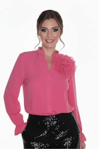 Блузка + топ. Блузка выполнена из креш-органзы. Блузка прямого силуэта, длиной выше линии бедер. Перед и спинка цельные. Спереди прорезь. Воротник-стойка, переходящий в бант. Рукав втачной, одношовный, расширенный к низу и присборенный. Низ рукава на притачной манжете, застегивающейся на четыре пуговицы. В комплект входит топ на регулируемых бретелях. Перед и спинка топа цельные.
