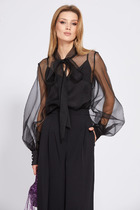 Блуза женская выполнена из струящейся гладкой с атласным блеском ткани, блуза полуприлегающего силуэта, горловина округлая с воротником- завязкой. Рукав втачной, длинный по низу рукава расположена манжета. Спинка изделия с разрезом и застежкой петля- пуговица на стойке.