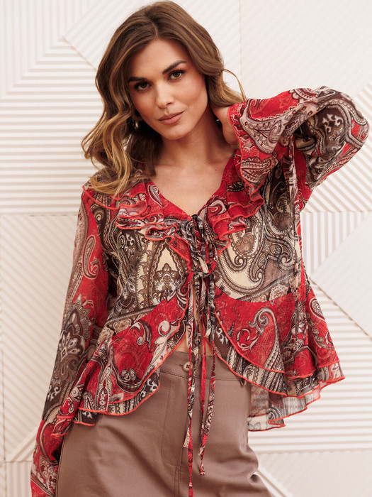 Блузка свободного силуэта в стиле бохо. Перед с нагрудными вытачками. Вдоль горловины, вдоль борта с переходом на спинку двойные рюши. Блузка спереди на завязках. Рукав втачной одношовный. Низ рукава с притачной рюшей и завязками. Длина блузки- 58 см, длина рукава блузки - 62 см.