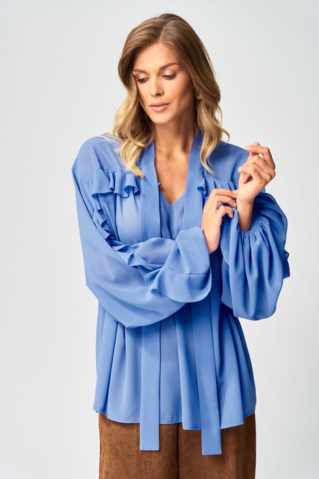 Блузка свободного силуэта из струящейся шифоновой ткани. Перед и спинка с кокеткой и сборкой. Рукав спущенный свободный с резинкой понизу. Вдоль линии кокетки и рукава вставлена рюша. Горловина V-образной формы с воротником стойкой переходящей в бант. Длина блузки - 67 см, длина рукава - 60 см. Обратите внимание! Данная модель прекрасно сочетается с другими моделями из нашей коллекции 35204 и 15377 в коричневом цвете. Создайте гармоничный образ, комбинируя эти изделия!