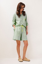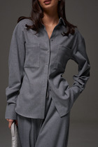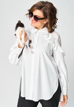 Блузка оригинальная приталенного силуэта из вельветовой ткани. Перед с подрезом под грудью, сборкой в районе груди и талиевыми вытачками. Затсежка на петли и пуговицы. Горловина V-образной формы. Спинка с талиевыми вытачками. Рукав втачной со сборкой по окату и с манжетой по низу. Манжета высокая с двумя петлями и пуговицами. Длина блузки - 63 см, длина рукава блузки - 64 см.