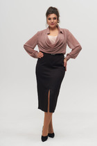 Блузка с застежкой на петли и пуговицы, втачным воротником с отрезной стойкой. По правой полочке- накладной карман. Спинка с отрезной кокеткой. Низ блузки фигурный. Рукав втачной, длинный, с отрезной манжетой.