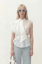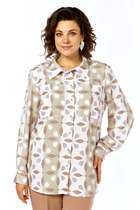 Блузон свободного силуэта со спущенной линией проймы и укороченным втачным рукавом длиной 26 см. Горловина округлая, оформлена планкой 2,8 см. Длина блузона по спинке 65-68 см (в зависимости от размерного ряда). Низ изделия и рукавов обработаны открытым срезом. Верхние детали изделия отлетные и имитируют силуэт майки без рукавов и состоят из мерцающего трикотажного полотна с пайетками.