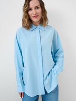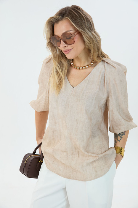 Блузка свободного кроя с объёмными рукавами- фонариками на резинке длиной до локтя. Горловина блузки V-образная.