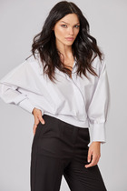 Блуза прилегающего силуэта из экокожи с ассиметричным низом. Горловина с цельнокроеной стойкой. По переду декоративные складки, выходящие из плеча и бокового шва. На спинке в центральном шве потайная молния и талиевые вытачки.