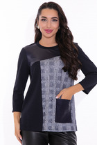Блуза прямого силуэта. В боковых швах разрезы . Низ разноуровневый. По переду нагрудные вытачки и декоративная вышивка. Спинка со средним швом.Плечо немного спущено. Рукав рубашечного покроя , 3/4, слегка расширен к низу. Горловина "лодочка".