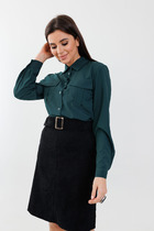 Женская блузка свободного силуэта с рубашечным воротником. Передние полочки  изделия отрезные с нагрудными и рельефными вытачками. По переду блузки потайная планка на застежку на пуговицы. Рукав прямой, втачной, длинной  до локтя с патой на пуговицу. Спинка с кокеткой и сборкой. Низ изделия рельефный, спинка длиннее.   Замеры изделия в готовом виде:
