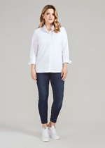 Женская блузка свободного кроя с цельнокроеным рукавом. Горловина округлой формы, обработана обтачкой. Рукав длинной 7/8 с манжетой на застежку - пуговицу. Передняя полочка изделия с отлетной вертикальной планкой по центру. Спинка блузки стачная по центру с застежкой на пуговицу в верхней части. По боковым швам блузки разрезы.