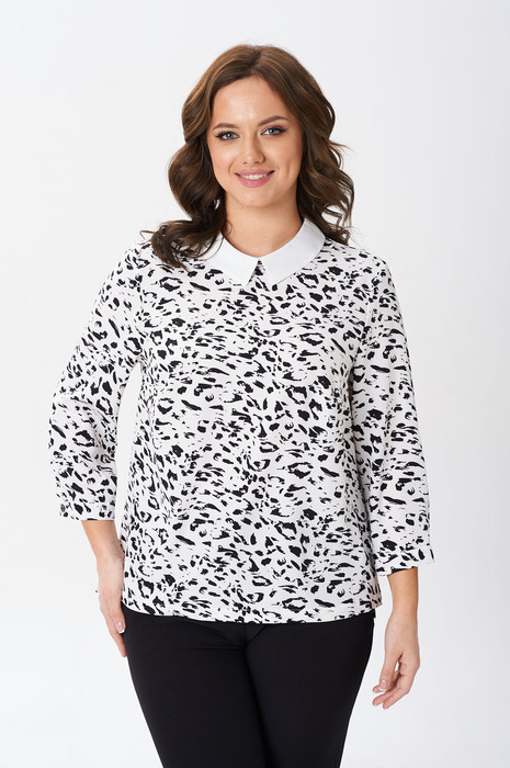 Женская нарядная блузка c акцентным воротником белого цвета. По передним полочкам заложены нагрудные вытачки. На спинке блузки планка с застёжкой на петли пуговицы от верха до низа. Рукав длинной за локоть с манжетой на застежку петля-пуговица. Спинка изделия немного длиннее переда. По боковым швам небольшие разрезы.