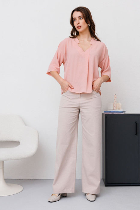 Элегантная блуза с V-образным вырезом горловины и воротником стойкой, без застёжки. Спинка и полочка цельные, на полочке заложена односторонняя складка. Линия плеча приспущенаи. Рукав три четверти со складками.