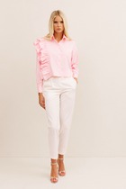 Детали: прямой силуэт, воротник-стойка переходящий в бант, кокетка переда и спинки, V-образный вырез с застежкой на петли и пуговицы, рукава втачные со сборкой и широкими манжетами