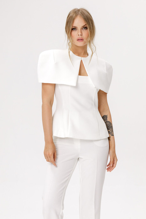 Детали: блуза прилегающего силуэта, кареобразный вырез горловины переда и спинки, рельефные швы, потайная застежка по спинке, на подкладке. Кейп с круглой горловиной и вытачками по плечам, плечевые накладки, застежка на навесную петлю и пуговицу, на подкладке. Кейп не имеет переда и спинки.