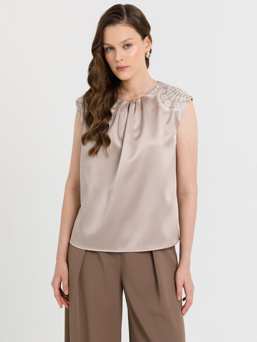 Модель полуприлегающего силуэта, со спущенным плечом и настроченными фигурными кокетками из кружева. Спереди по горловине заложена группа складок. Сзади вырез \"капелька\" и застёжка на пуговицу и воздушную петлю. В боковых швах небольшие разрезы.