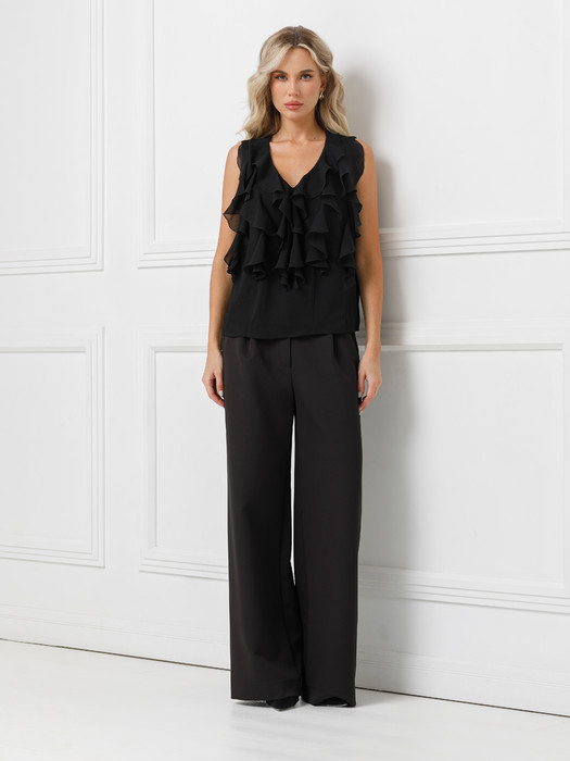 Модель прямого силуэта, на подкладе, без застёжки. Перед с рельефами и средним швом. Блузка декорирована воланами.