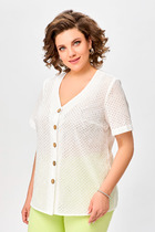 Блузка женская, прямого силуэта из хлопчатобумажной лёгкой ткани «ришелье». Застёжка центральная на петли и декоративные пуговицы. По переду блузы обработаны нагрудные выточки. Спинка цельнокроеная.  Горловина с V-образным вырезом. Рукав втачной короткий.