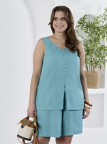 Блузка женская из гладкокрашеного тканого полотна, полуприталенного силуэта, без рукавов, с V-образной горловиной и вытачками в области груди. Перед состоит из двух частей, в шве соединения деталей разрез. От горловины до разреза пришиты декоративные пуговицы имитирующие застежку. Горловина и проймы окантованы основным материалом.