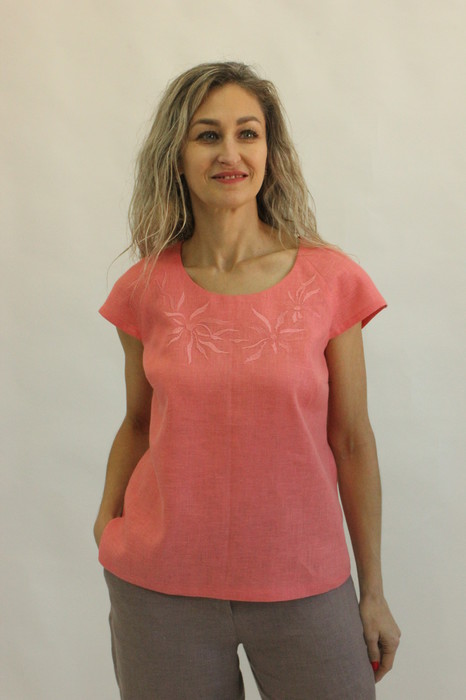 Блуза полуприлегающая. Рукав реглан короткий.По бокам разрезы. Полочка декорирована вышивкой. Длина изделия 62 см