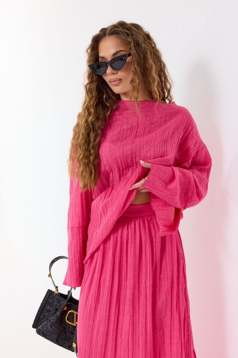 Блузка свободной формы. Спущенная линия плеча. Застежка на завязках. Рукав прямой, свободный. По низу рукава манжета с разрезом.