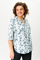 Блузка из плательно - блузочной ткани свободного силуэта. Спинка с кокеткой и встречной складкой. По переду центральная застежка на кнопки, сверху накладные карманы с клапанами. Втачной рукав с отстегивающейся нижней частью. По низу рукава манжет с кнопкой. Воротник рубашечный со стойкой.