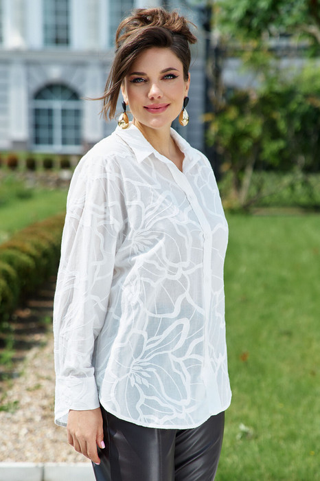 Блузка «оверсайз» с центральной застёжкой на петли-пуговицы по планке, воротником рубашечного типа. Спинка с притачной кокеткой. Линия плеча в блузке спущенная, рукав втачной с притачной манжетой по низу. Низ в блузке фигурной формы. В качестве декоративного отделочного элемента в блузке – отделочные строчки в тон ткани.