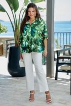 Эта блузка — словно кусочек жаркого лета, пойманный в летящей ткани. «Оверсайз» силуэт создает ощущение свободы и небрежной элегантности, а яркий «тропический» принт напоминает о солнечных террасах, лазурном побережье. Это не просто одежда — это настроение, застывшее в ткани, готовое оживить любой образ щедростью южного солнца. Ткань на ощупь прохладная и шелковистая, она струится по телу, повторяя каждое движение, словно второе дыхание летнего бриза. Крой создает эффект намеренно свободного, но стильного образа.
