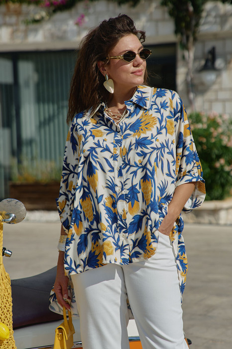 Эта блука — словно кусочек итальянского лета, пойманный в летящей ткани. «Оверсайз» силуэт создает ощущение свободы и небрежной элегантности, а яркий итальянский принт напоминает о солнечных террасах, виноградниках Тосканы и лазурном побережье Амальфи. Это не просто одежда — это настроение, застывшее в ткани, готовое оживить любой образ щедростью южного солнца. Ткань на ощупь прохладная и шелковистая, она струится по телу, повторяя каждое движение, словно второе дыхание летнего бриза. Крой создает эффект намеренно свободного, но стильного образа. Блузка «оверсайз» силуэта с центральной застёжкой на петли-пуговицы по планке, воротником рубашечного типа со вставкой декоративной бахромы. Рукав в блузе цельнокроеный со сборкой на притачной манжет по низу. По спинке блузки отрезная кокетка со сборкой от подреза. Низ в блузке ассиметричный, фигурной формы. Эта рубашка создана для современной женщины, которая ценит комфорт, не жертвуя стилем, и помнит, что настоящая элегантность — в умении быть собой в любой ситуации. Длина блузки 84 см, длина рукава 44 см (р 50-54), 45 см (р 56-60).
