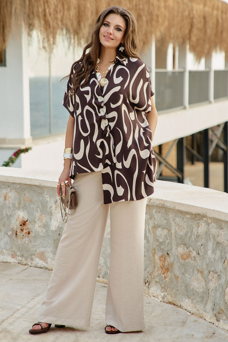 Блузка представлена как многофункциональный элемент гардероба, который сочетает в себе эстетическую глубину и практическую универсальность, становясь " холстом для образов". Крой — свободный, но не мешковатый. Универсальность — подходит для работы, встречи с друзьями, прогулки, путешествия. Современность — вне сезонных трендов, но в тренде на осознанное потребление. Блузка не облегает — она скользит. Она не описывает фигуру — она её окутывает. Блузка свободного силуэта с ассиметричной линией борта с заложенными складками, имитацией застёжки на декоративные пуговицы. Горловина в блузке с отложным воротником со стойкой. Рукав в блузке цельнокроеный. Спинка с отрезной кокеткой. Низ в блузке ассиметричный с разрезами в боковых швах. Длина блузки 69 см (р 52-56), 72 см (р 58-62). Длина брюк 108 см.