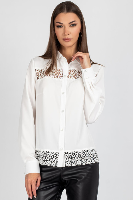 Передняя часть c нагрудными выточками, обеспечивающими комфортную посадку. Центральная бортовая застёжка — на 6 или 7 пуговиц (в зависимости от размера), придаёт образу классическую завершённость. Особое внимание привлекает кружево, изящно нашитое в верхней и нижней части переда — оно добавляет лёгкости и утончённости, делая блузку особенно женственной.
