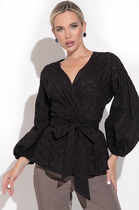 Базовая блузка из шифона, свободного кроя. Рукав длинный, втачной, с резинкой по низу. Особую оригинальность этой блузке придает бант на горловине. Эту нарядную блузку можно комбинировать и с юбкой, и с брюками.