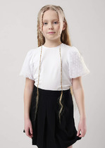 Джемпер именуемый "блузка" для девочек из высококачественного трикотажа(кулирка качество пенье). Блузка свободного покроя на манжете. По полочке проходит вертикальная декоративная бантовая складка.Планка декорирована пуговицами. Рукава длинные втачные из шифона. По длине рукава проходит ломпас из трикотажа. Модель с отложным воротником и застежкой сзади. Трикотажная блузка не деформируется после стирки, очень удобна и комфортна для вашего ребенка.