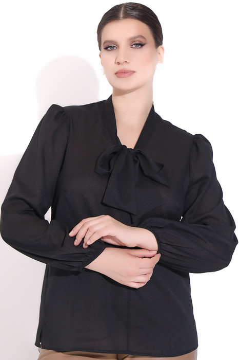 Романтичная блузка из шифона, свободного кроя. Рукав длинный, втачной, с резинкой по низу. Особую оригинальность этой блузке придает бант на горловине. Эту нарядную блузку можно комбинировать и с юбкой, и с брюками.