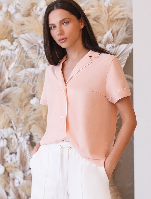 Состав: 92%Хлопок 8%ПУ Плотность: 170 Г/м2Блузка с английским воротом выполнена из эластичного хлопка. Модель дополнена контрастным кантом. Самые мягкие волокна премиального хлопка гарантируют непревзойденный комфорт в течении всего дня. Эластан в составе изделия, поддерживает форму и препятствует сминаемости. Сочетается в костюме с шортами D48.006 и брюками D44.120