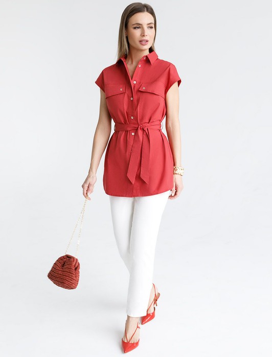 Состав: 100%Хлопок Параметры модели на первом фото: Рост 170, бюст 89, талия 63, бедра 92 Размер товара на первом фото: 42Удлиненная блузка в стиле сафари из легкого хлопкового поплина. Модель со спущенной линией плеча дополнена двумя накладными карманами. В комплекте идет пояс из основного полотна. В изделии будет комфортно, даже в самое жаркое время года. Подходит для любой фигуры. Сочетается в костюме с кюлотами D24.233 и юбкой D26.179