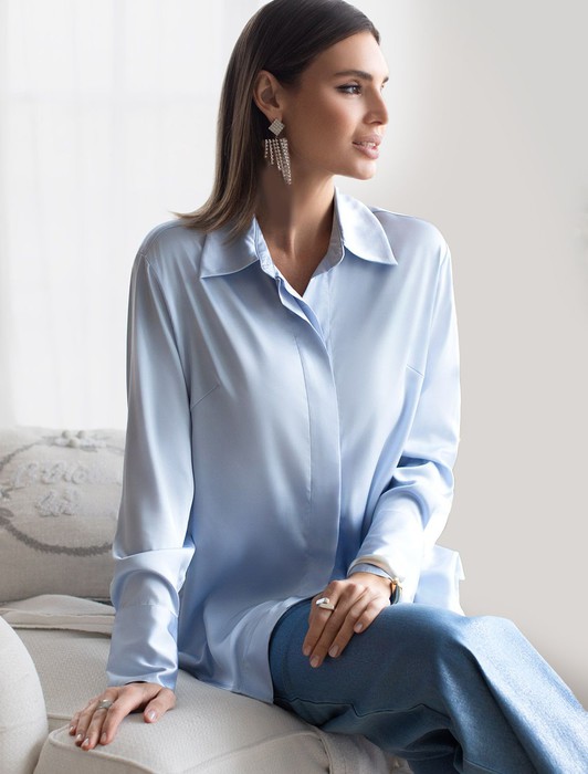 Состав: 94%ПЭ 6%ПУ Плотность: 107 Г/м2 Параметры модели на первом фото: Рост 170, бюст 89, талия 63, бедра 92 Размер товара на первом фото: 42Сатиновая блузка с эластаном в голубом цвете – воплощение элегантности и комфорта. Благородный блеск сатина добавляет образу шика, а эластичность материала гарантирует удобство при носке. Прямой силуэт блузки обеспечивает комфорт, а эластичность материала предотвращает деформацию. Застежка-планка с потайными пуговицами придает модели аккуратность. Универсальный вариант для casual-образов.