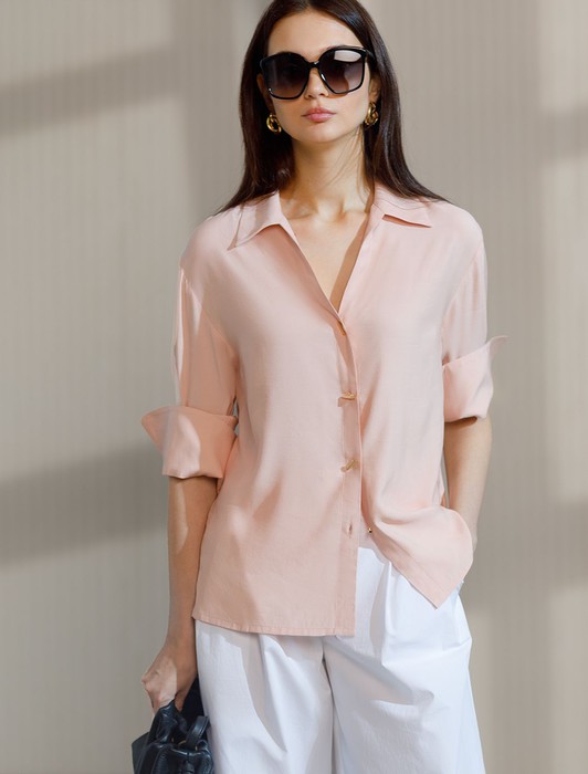 Состав: 55%Вис 45%Лиоцелл (Вис) Плотность: 115 Г/м2Блузка пудрового цвета сочетает в себе комфорт и элегантность благодаря материалу из вискозы с лиоцеллом. Аккуратный отложной воротник подчеркивает утонченность образа, а продолговатые металлические пуговицы золотистого цвета добавляют выразительный акцент и придают блузке благородный вид. Широкие манжеты на рукавах привлекают внимание и делают силуэт современным. Спущенная линия плеча формирует расслабленный, но стильный внешний вид, что идеально для тех, кто ценит индивидуальность и уверенность в деталях. Крой продуман так, чтобы подчеркивать достоинства фигуры и на больших размерах, создавая гармоничный силуэт без лишних усилий. Ткань из вискозы с добавлением лиоцелла обеспечивает приятные ощущения и отличную посадку, струится на теле и охлаждает в жаркую погоду. При пошиве использована технология «чистый край» по всей длине центральной планки и низу изделия. Это признак премиум качества — «чистый край» вместо оверлока. Блузку можно носить с топом, не застегивая — при этом распахнутая блузка будет выглядеть максимально эстетично.Рубашка легко впишется как в деловой гардероб, так и в повседневный стиль, позволяя выглядеть безупречно независимо от ситуации.